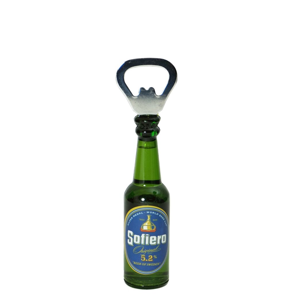 Magnetkapsylöppnare Sofiero. En kapsylöppnare med Sofieros logga på framsidan. Handtaget är utformat som en ölflaska och har en vätska inuti. Trivsam ölöppnare som har en magnet på baksidan för att kunna fästas på exempelvis ett kylskåp.Höjd: 13,7 cm