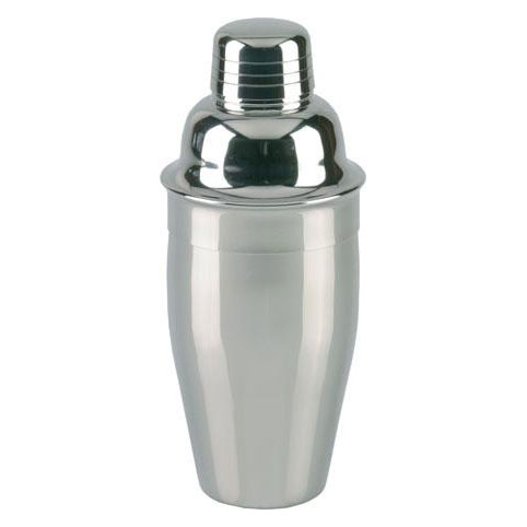 Tredelad cocktailshaker, polerad. En professionell och praktisk shaker i rostfritt stål som försetts med en sil i locket. Denna modell har designats med en liten kant på locket, vilket gör den lättare att öppna. Professionell modell av högsta kvalité.Volym: ca 65 cl