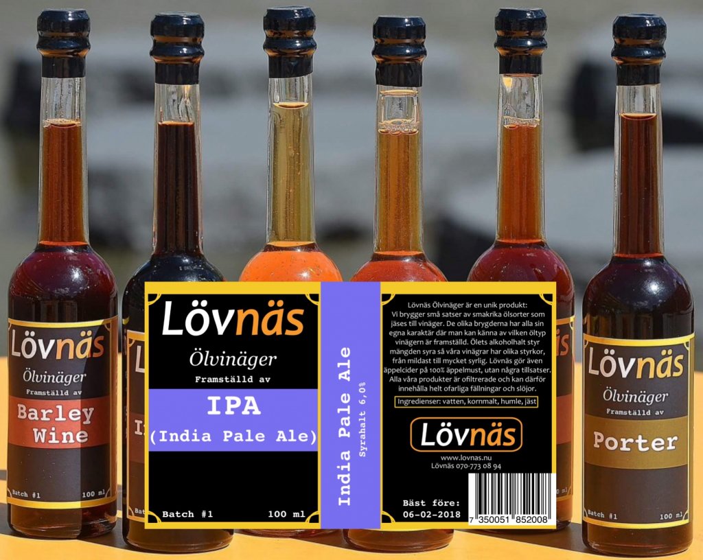 Lövnäs ölvinäger - IPA. I Mälardalen i närheten av Eskilstuna ligger musteriet- och vinägerbryggeriet Lövnäs. Deras högkvalitativa och hantverksmässigt producerade ölvinäger är unik på den svenska marknaden och med sina tydliga smaker och friska syra sätter den färg på alla möjliga anrättningar. Denna variant har tillverkats av en fräsch IPA och har en balanserad syra, med fruktiga drag åt citrus och humle.