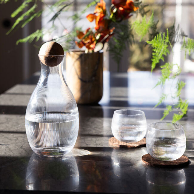 Karaffen kan fyllas med vin, vatten eller användas som en dekorativ vas. Den vackra kulan i certifierad ek fungerar både som kork och stilfull detalj, och ger karaffen en naturlig värme.